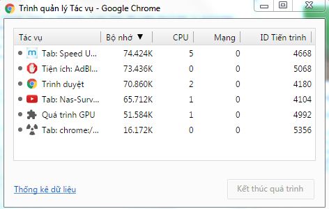 Bạn hãy bấm Shift + Esc để mở Task Manager của trình duyệt Chrome. Ở đó hiển thị tất cả các tab và phần mở rộng (extension) đang chạy. Chỉ đơn giản là ấn vào tab/extension cần tắt và nhấp End Process/Kết thúc quá trình.