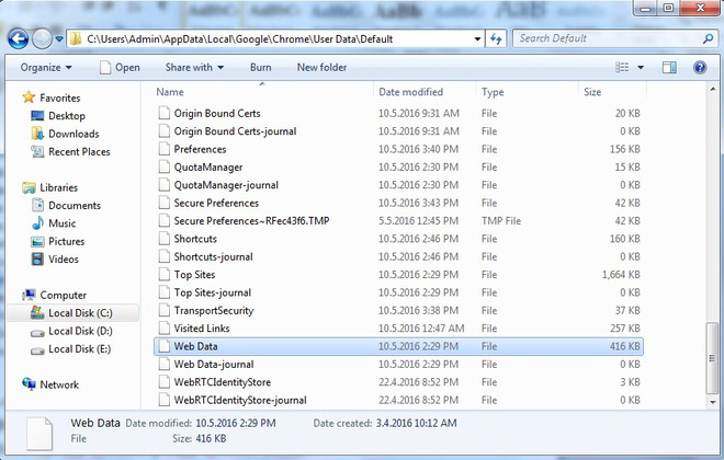 Với Windows, bạn hãy theo đường dẫn C:\Users\[Username]\AppData\Local\Google\Chrome\User Data\Default\ (thay thế [Username] bằng tên admin của bạn). Tìm xuống tới file “Web Data” và xóa nó đi.
