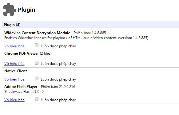 Bạn hãy gõ chrome://plugins/ vào thanh địa chỉ. Tìm đến phần cài đặt Adobe Player và ấn “Vô hiệu hóa” nó.
